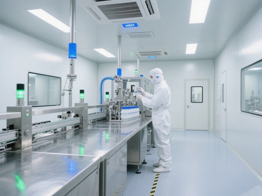 核心區(qū)域可見全封閉式潔凈廠房,墻面與地面采用無縫一體化設(shè)計(jì),避免積塵殘留。多組高效空氣過濾器整齊排列于頂部,通過層流送風(fēng)系統(tǒng)維持Class8級(jí)潔凈標(biāo)準(zhǔn)。?