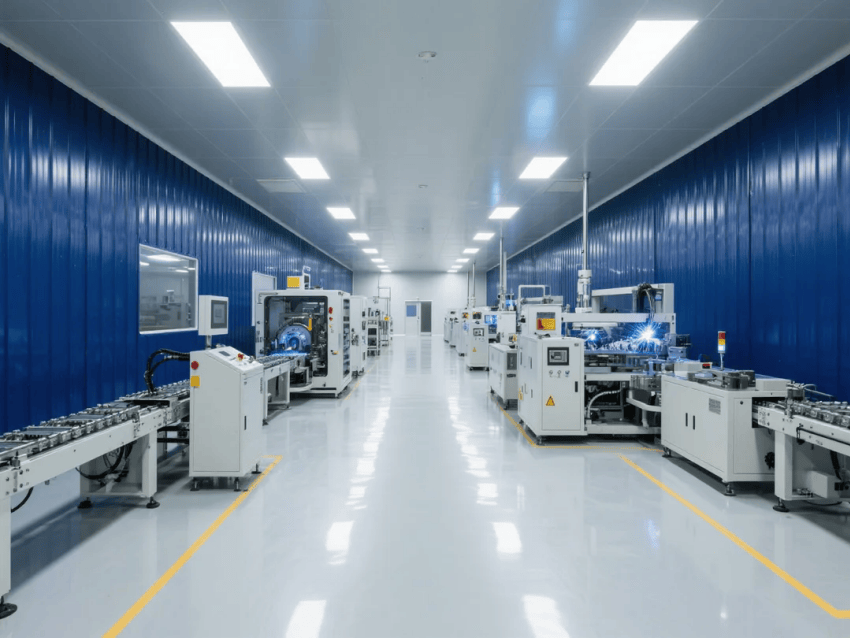 車間采用模塊化潔凈室結構,墻體采用50mm厚深藍抗菌彩鋼板,接縫處采用圓弧處理工藝。自動化沖壓線與激光焊接工作站呈U型交替布局,工作站間設置深灰不銹鋼傳遞窗,確保物料流轉潔凈度。吊頂系統配置FFU高效過濾單元,維持≥20次/h換氣次數,氣流組織采用頂送側回模式。