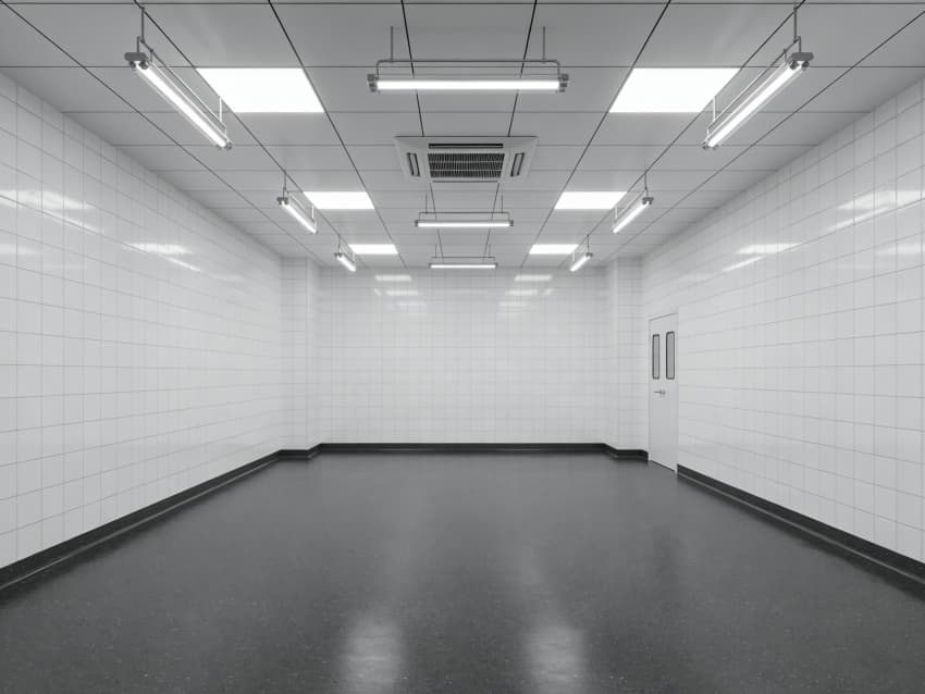 車間內(nèi)部施工工藝凸顯耐腐潔凈特性:地面采用深灰色重防腐環(huán)氧自流平工藝,經(jīng)基層噴砂處理、防腐底漆涂刷、環(huán)氧砂漿找平、自流平罩面四道關(guān)鍵工序,表面平整度誤差≤1mm/m,耐酸堿、耐有機(jī)溶劑腐蝕,附著力達(dá)2.0MPa以上;墻面采用白色食品級(jí)潔凈抗菌涂層施工,推行無縫拼接技術(shù),陰陽角采用R50圓弧倒角工藝,杜絕積塵死角,涂層硬度達(dá)2H,可耐受高頻次消殺。