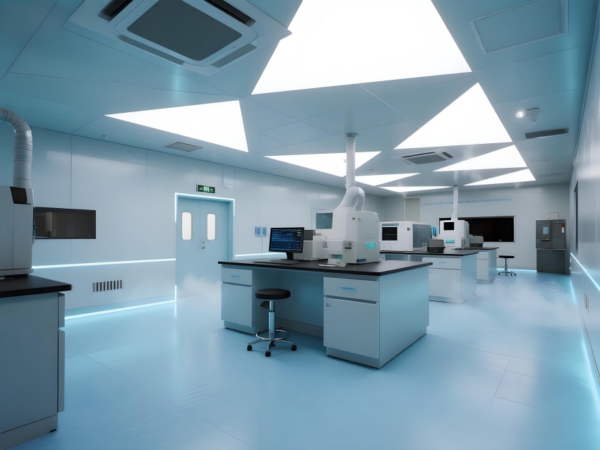 本實驗室以"絕對環境控制"為核心設計理念,整體采用冰川藍與鈦白灰的漸變配色。墻面嵌入式環境參數監測屏實時流動著翡翠綠數據流,與頂棚矩陣排列的微孔送風口形成科技韻律。核心實驗區采用圓弧形防結露玻璃隔斷,內置百級潔凈層流罩。地面鋪設防靜電陶瓷鋼板,接縫處嵌入LED環境達標指示燈。設備區裸露的銀色保溫管道與藍色冷媒管構成工業美學展陳,智能除濕機組通過半透明外殼展示內部冷凝過程。數據中控室配備270°曲面監控屏,懸浮粒子濃度以動態星云圖呈現。空間通過嚴謹的幾何分割與流體力學曲線結合,在極致環境控制要求下,打造出兼具科研嚴肅性與星際艙未來感的頂級實驗環境。