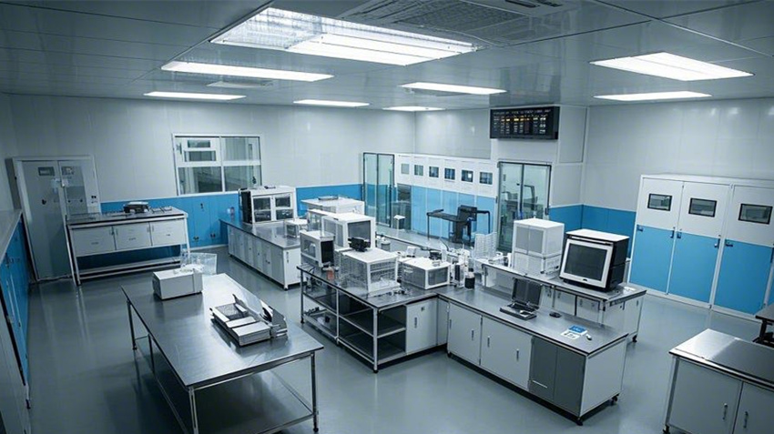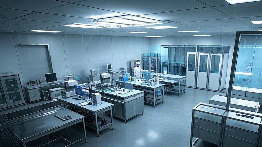 1000平方米電子無(wú)塵車(chē)間,現(xiàn)代科技風(fēng)格,干凈整潔,光線明亮。核心生產(chǎn)區(qū)占70%,輔助區(qū)占20%,辦公區(qū)占10%。核心生產(chǎn)區(qū):防靜電環(huán)氧地坪(淺灰色),白色彩鋼板墻面和天花板,垂直層流氣流,頂部高效過(guò)濾器(HEPA),不銹鋼工作臺(tái),設(shè)備排列整齊。輔助區(qū):更衣室(淺藍(lán)色墻面,衣柜和長(zhǎng)凳),風(fēng)淋室(透明玻璃門(mén),不銹鋼墻面),物料緩沖間(傳遞窗,白色墻面)。辦公區(qū):玻璃隔斷,現(xiàn)代簡(jiǎn)約辦公桌,防靜電PVC地板(淺色),LED面板燈。整體色彩:白色、淺灰色、科技藍(lán)點(diǎn)綴。