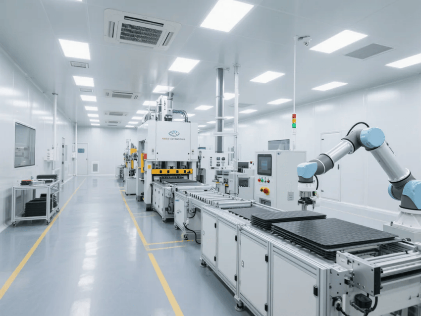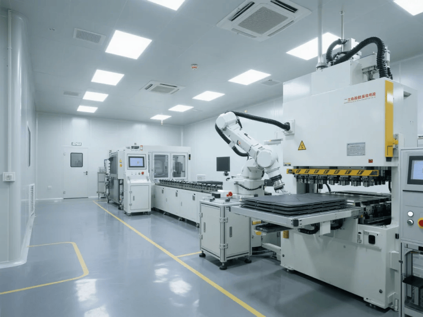 智能化配置:集成環境監測與設備聯動系統,白色彩鋼板墻面嵌裝LED智能看板,實時顯示生產數據與潔凈參數。機械臂工作站配備藍光定位系統,與金屬灰地坪形成科技視覺呼應。
