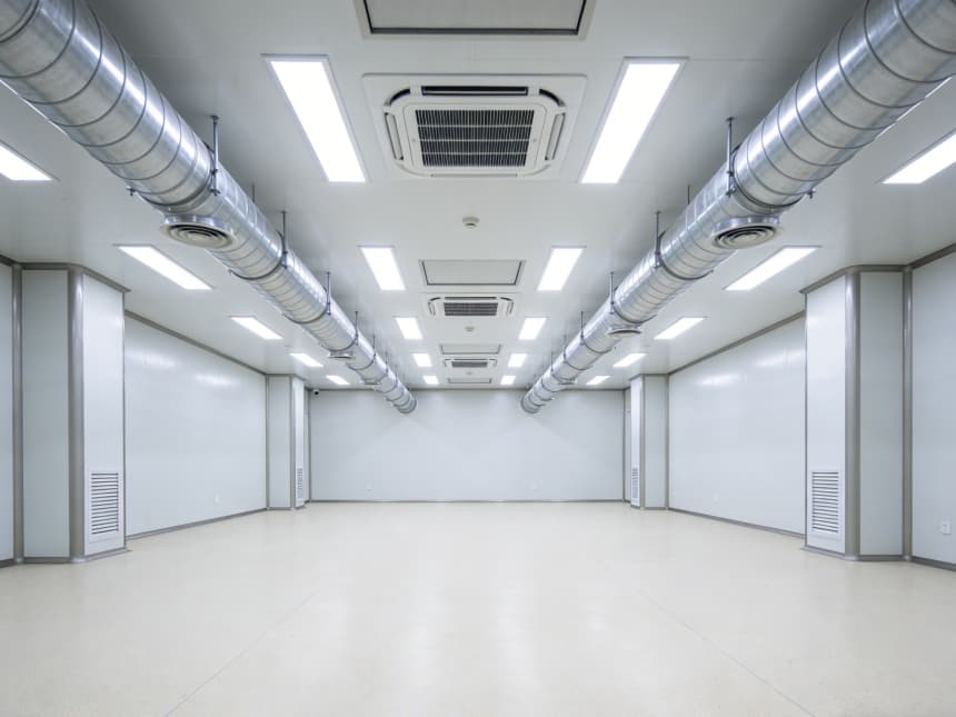 車間統一遵循半導體級潔凈標準,地面為淺灰色防靜電環氧地坪,墻面采用白色無縫抗菌涂層,消除清潔死角。各車間功能精準分區:外延生長車間預留恒溫恒濕及氣體管路接口,適配高純度氣體輸送;光刻車間采用密閉避光設計,預留高效過濾送回風系統;蝕刻車間強化耐腐蝕處理,配備排風凈化預留接口;封裝測試車間規劃分區工位,預留精密檢測設備安裝基礎。