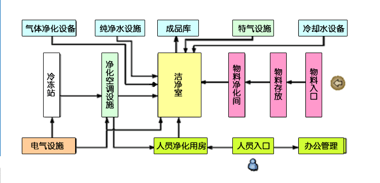 LED/液晶/線路板潔凈無塵室除了要完成上述的功能、目的外,因為制造過程中工藝生產設備都是在潔凈無塵室內操作的,以供生產工藝機臺使用,潔凈無塵室與各系統關系如下: