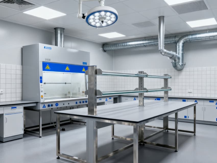 潔凈度執行分級標準:核心操作區達萬級(ISO8級),每立方米空氣中≥0.5μm微粒≤352000個;輔助區域為十萬級(ISO9級),通過初效-中效-高效三級空氣過濾系統,配合側送頂回氣流設計,實現每小時18-22次空氣置換。墻面采用耐酸堿潔凈彩鋼板,地面為防滑PVC無菌卷材,所有接縫密封處理;溫度穩定在22±2℃,濕度控制在45%-55%,關鍵區域維持微負壓,有效避免試劑交叉污染與有害氣體擴散,完全符合生化實驗室建設規范。