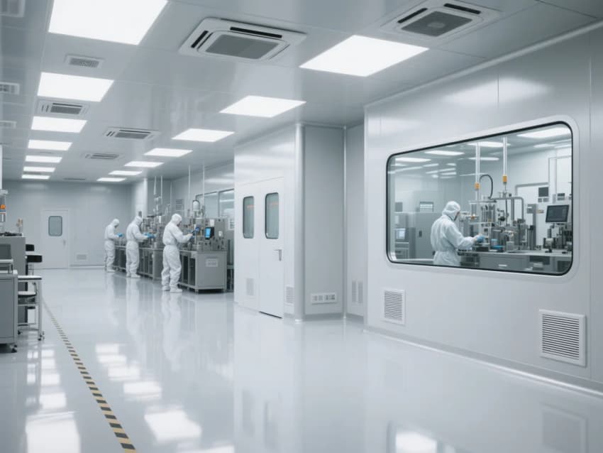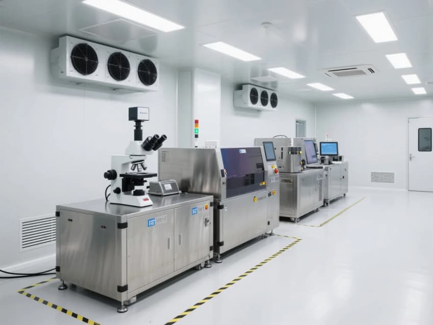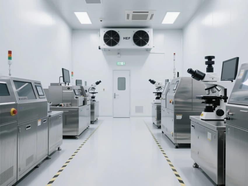 本方案采用"科技極簡主義"風格,以ISO 5級(萬級)潔凈標準為核心。空間設計強調線性流動感,灰白主色調搭配防靜電環氧樹脂地坪,墻面采用抗菌彩鋼板。頂棚網格化FFU送風單元配合側墻回風,形成垂直層流。功能分區明確,包含更衣緩沖間(Class 7)、核心生產區(Class 5)、設備維護通道。智能控制系統集成溫濕度(22±1℃/45±5%)、壓差(+10Pa)、粒子監測顯示。創新采用LED黃光照明減少光致氧化,設備基座增設主動減震系統。設計融合人機工程學,防靜電設施覆蓋率100%,通過藍色光帶引導潔凈動線,實現功能性與未來感的完美平衡。