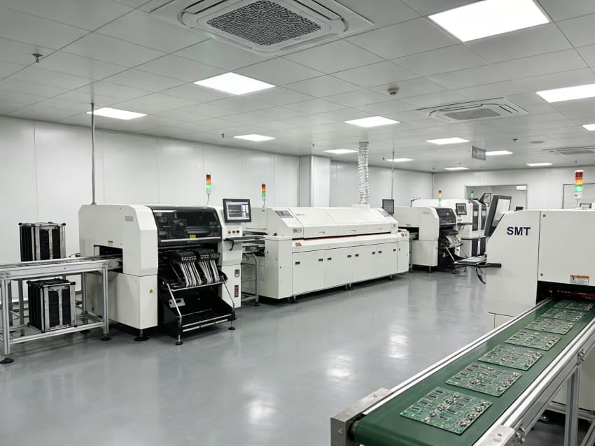 SMT 核心生產區:針對高速貼片機、回流焊等設備做了地面承重加固與管線預埋,配置伸縮式通風除塵管道,及時收集焊煙與粉塵;防靜電工作臺搭配 LED 工位燈,保障貼片、焊接的精度與效率。