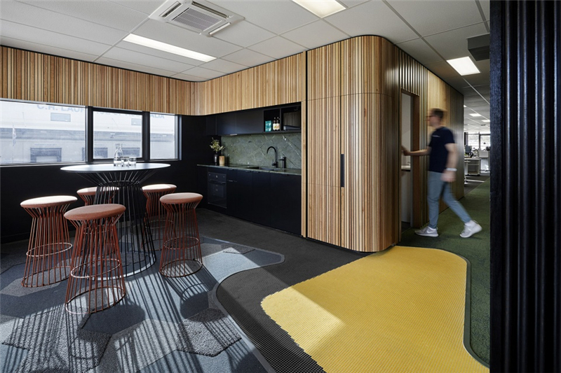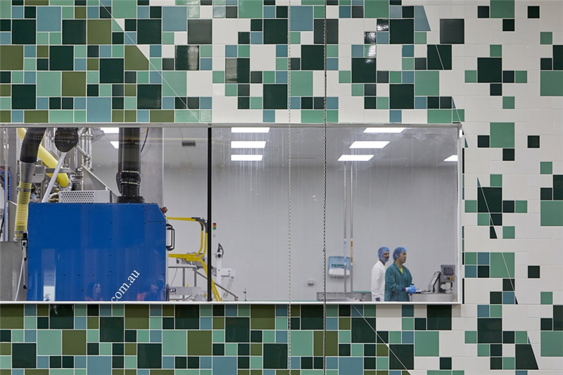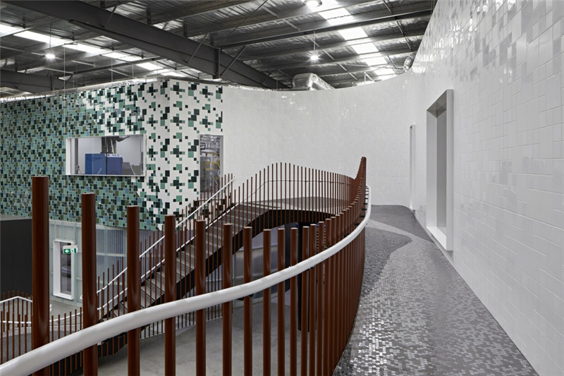 多彩的線條從附近的自然保護區(qū)一直延伸到位于生產(chǎn)區(qū)核心地帶的巨型壁畫上,吸引著員工和參觀工廠的訪客。產(chǎn)自本地的澳洲硬木和紋理豐富的墻面從外部景觀“流進”室內,在自然光線的配合下營造出富有生機的氛圍。