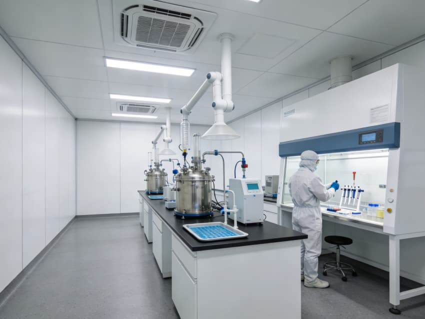 白色墻面采用食品級潔凈抗菌涂層,推行無縫拼接工藝,陰陽角圓弧倒角設計消除清潔死角,潔凈度可達Class 7級標準。車間科學劃分抗體表達區、偶聯反應區、純化區等功能區域,各區域配備獨立層流凈化與負壓防護系統,偶聯區預留精密溫控與惰性氣體接口,純化區設置無菌物料傳遞窗口,全方位規避交叉污染,保障研發生產的安全性與合規性。