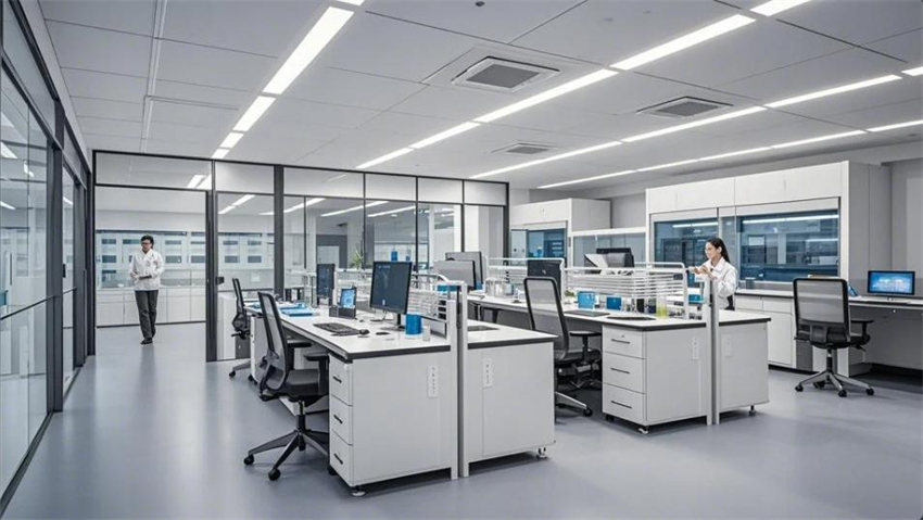 1000平方米生物實(shí)驗(yàn)室整體裝修,現(xiàn)代科技風(fēng)格,實(shí)驗(yàn)室分為核心實(shí)驗(yàn)區(qū)、設(shè)備區(qū)、樣品存儲(chǔ)區(qū)和辦公區(qū)。核心實(shí)驗(yàn)區(qū)占50%,設(shè)備區(qū)占30%,樣品存儲(chǔ)區(qū)占10%,辦公區(qū)占10%。核心實(shí)驗(yàn)區(qū):防靜電環(huán)氧地坪(淺灰色),白色彩鋼板墻面和天花板,頂部高效過濾器(HEPA),不銹鋼實(shí)驗(yàn)臺,設(shè)備排列整齊。設(shè)備區(qū):精密儀器整齊排列,地面為防靜電PVC地板(淺色)。樣品存儲(chǔ)區(qū):冷藏柜和樣品架整齊,溫濕度控制。辦公區(qū):玻璃隔斷,現(xiàn)代簡約辦公桌。整體色彩:白色、淺灰色、科技藍(lán)點(diǎn)綴。