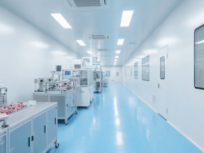 本工程嚴格遵循ISO14644-1Class7及GMP醫療器械生產規范,打造高標準的生物醫療器械制造環境。車間采用醫療級白色抗菌彩鋼板與淺藍防靜電環氧地坪的潔凈配色方案,營造安全、精準的生產空間。